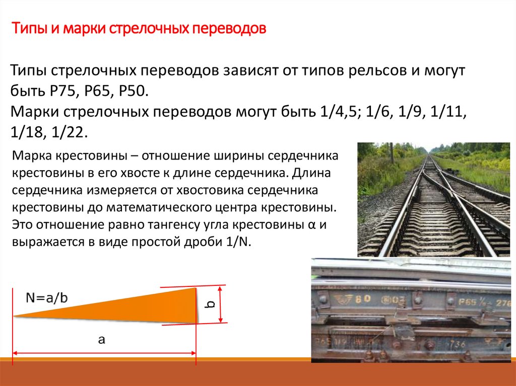 Марки стрелочных переводов могут быть 1/4,5; 1/6, 1/9, 1/11,