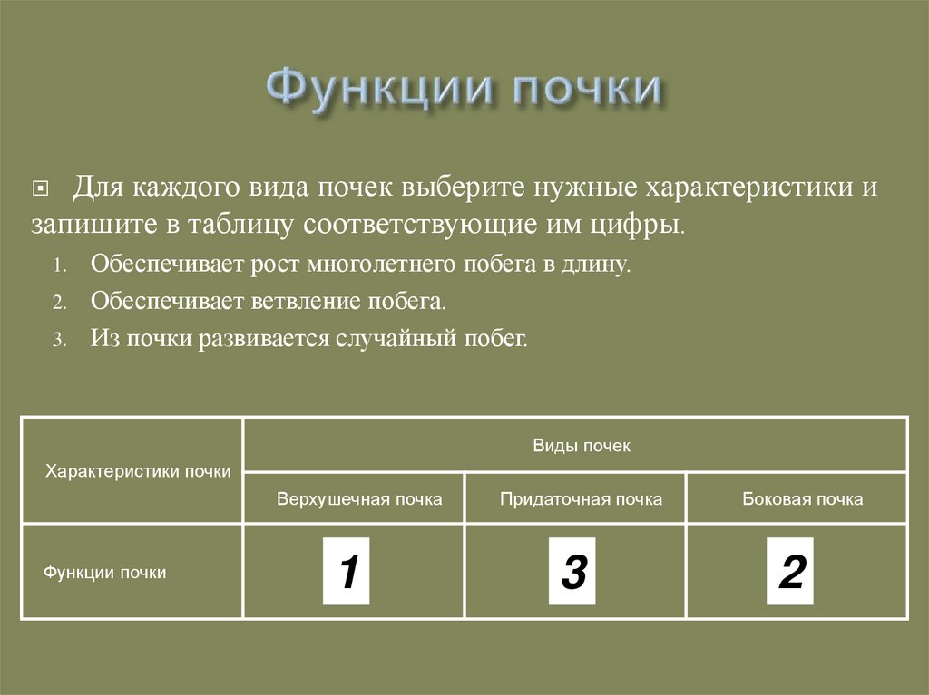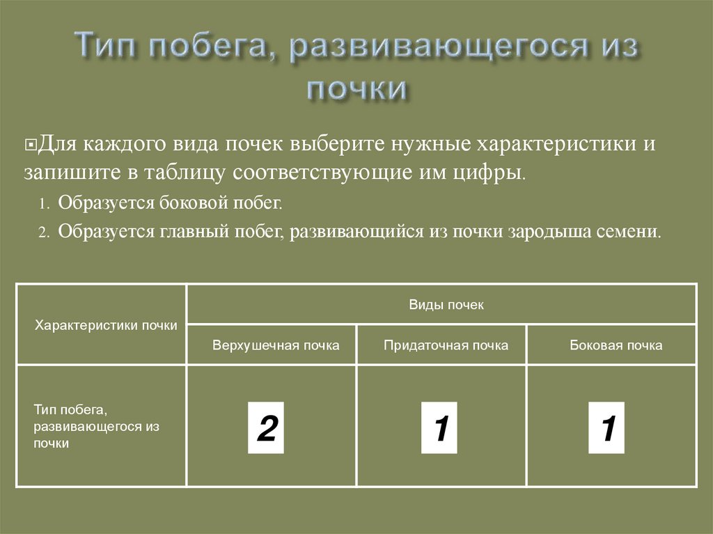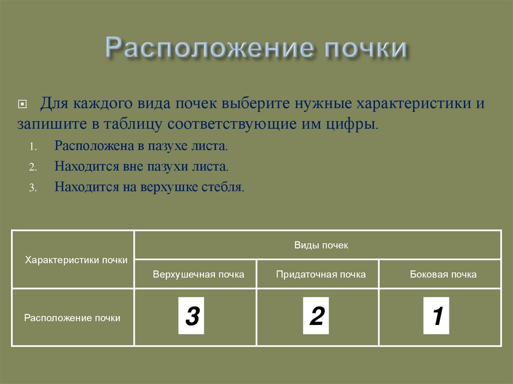 Для каждого вида почек выберите нужные характеристики изапишите в таблицу соответствующие им цифры.