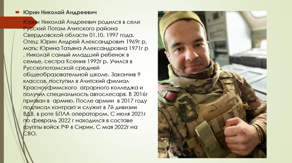 Юрин Николай АндреевичЮрин Николай Андреевич родился в селе