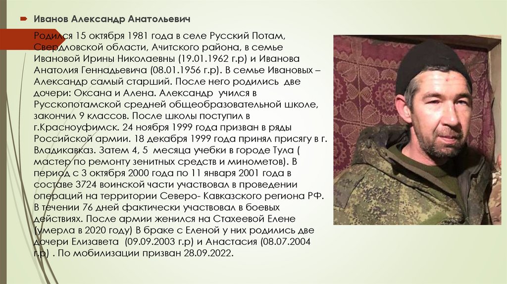 Иванов Александр АнатольевичРодился 15 октября 1981 года в селе Русский Потам,