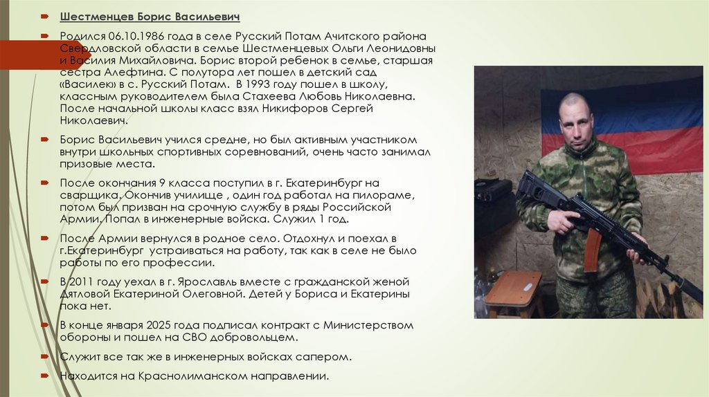 Шестменцев Борис ВасильевичРодился 06.10.1986 года в селе Русский Потам Ачитского района