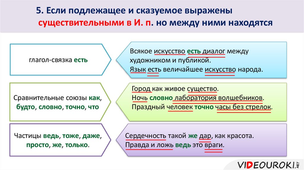 5. Если подлежащее и сказуемое выраженысуществительными в И. п. но между ними находятся