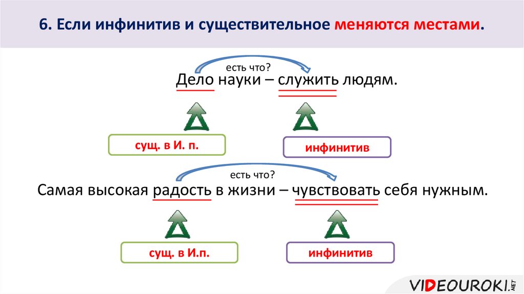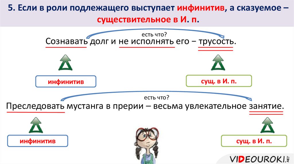 5. Если в роли подлежащего выступает инфинитив, а сказуемое –существительное в И. п.