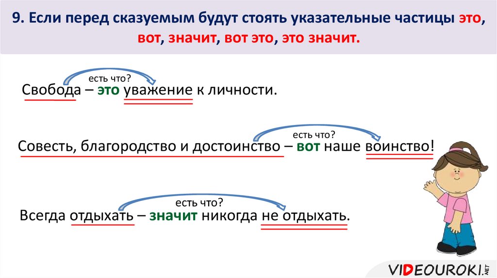 9. Если перед сказуемым будут стоять указательные частицы это,вот, значит, вот это, это значит.