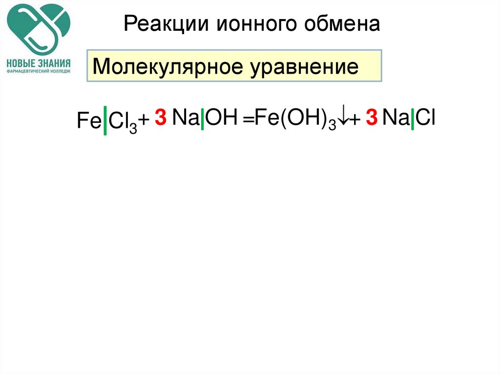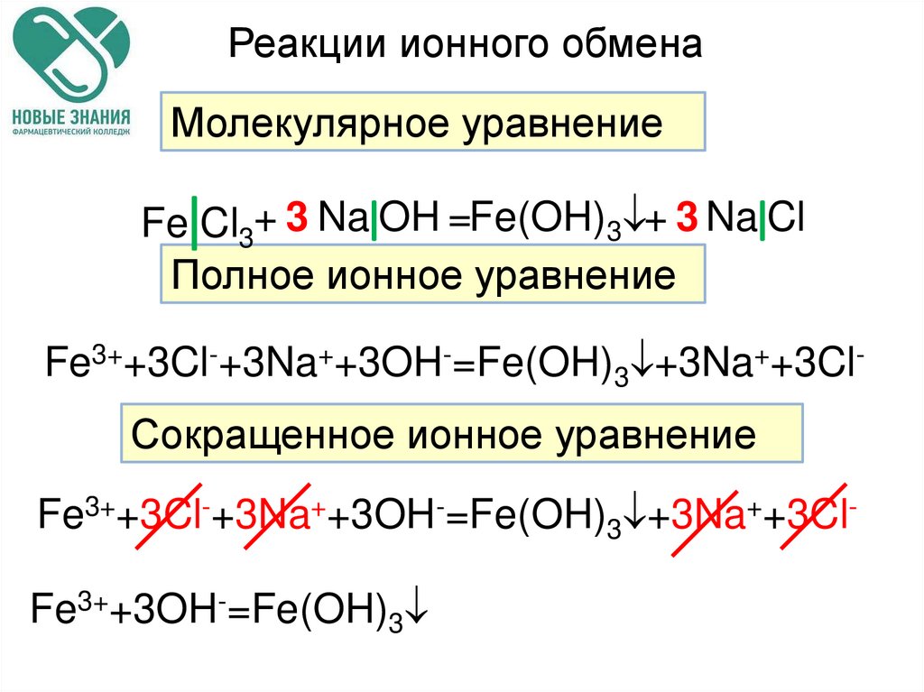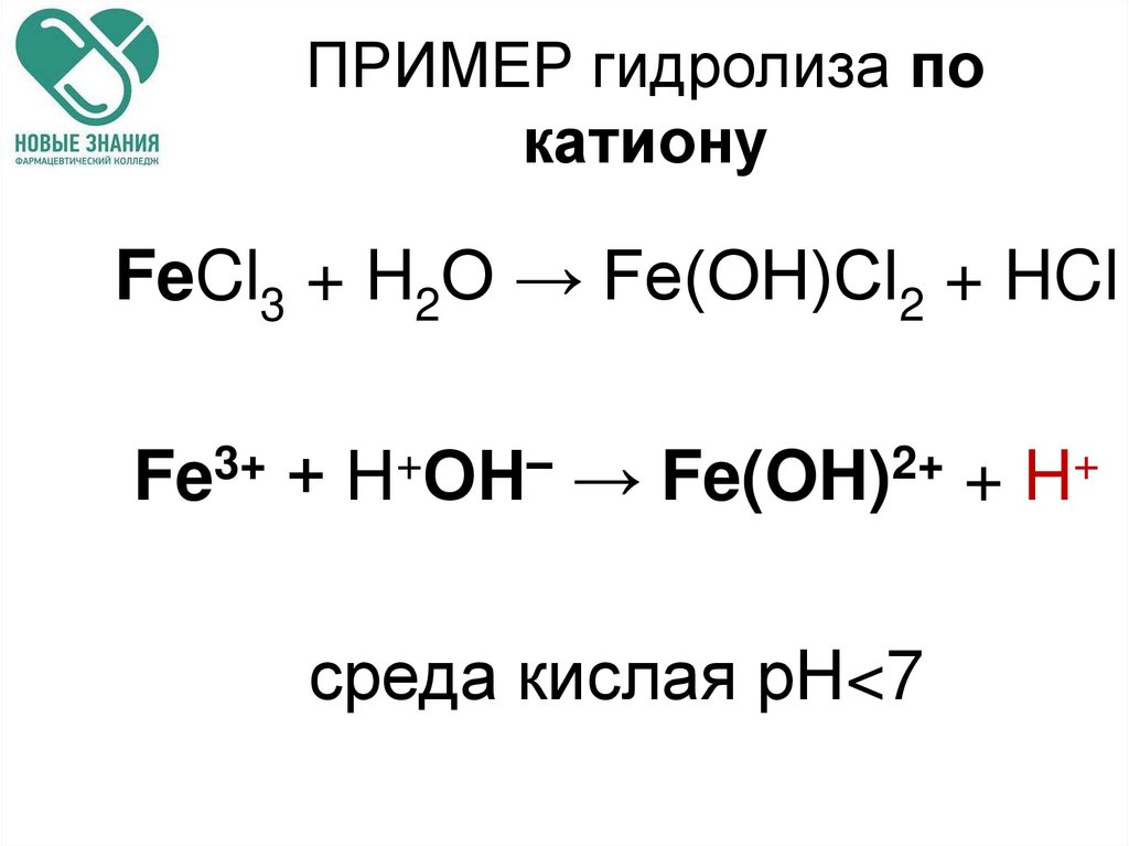 FeCl3 + H2O → Fe(OH)Cl2 + HClFe3+ + Н+ОН– → Fe(OH)2+ + H+