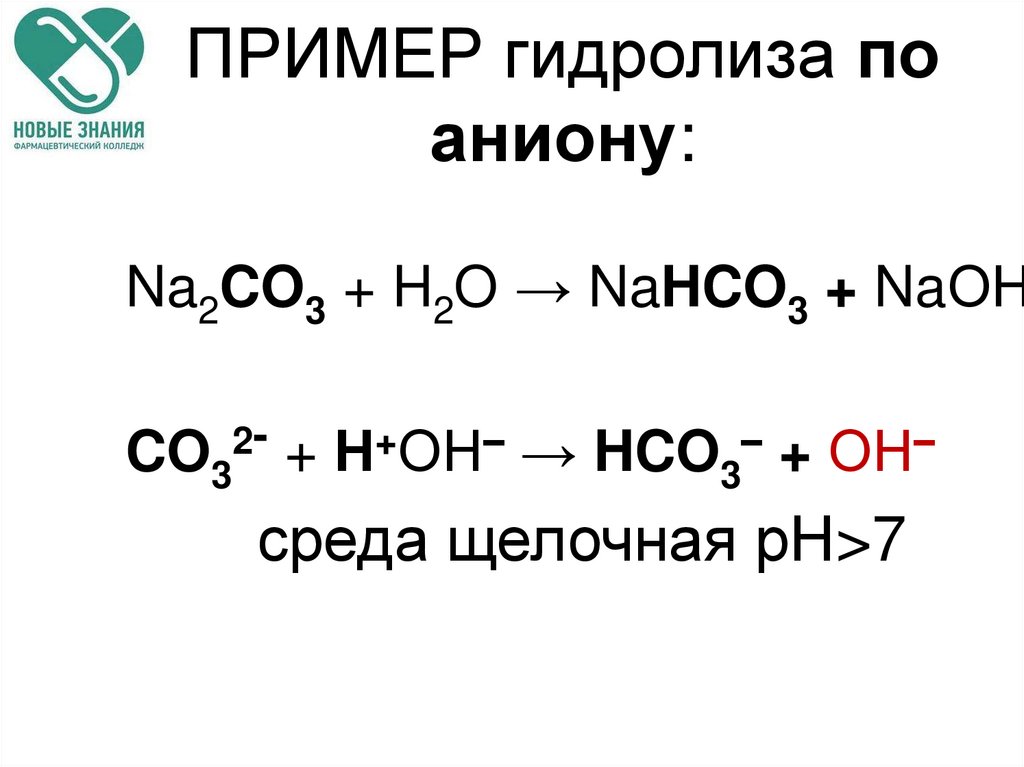 Na2CO3 + H2O → NaHCO3 + NaОНCO32- + Н+ОН– → HCO3– + ОН–