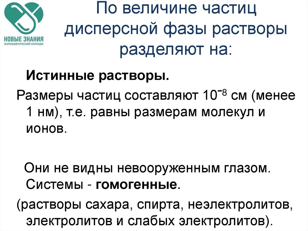 Истинные растворы.Размеры частиц составляют 10ˉ8 см (менее