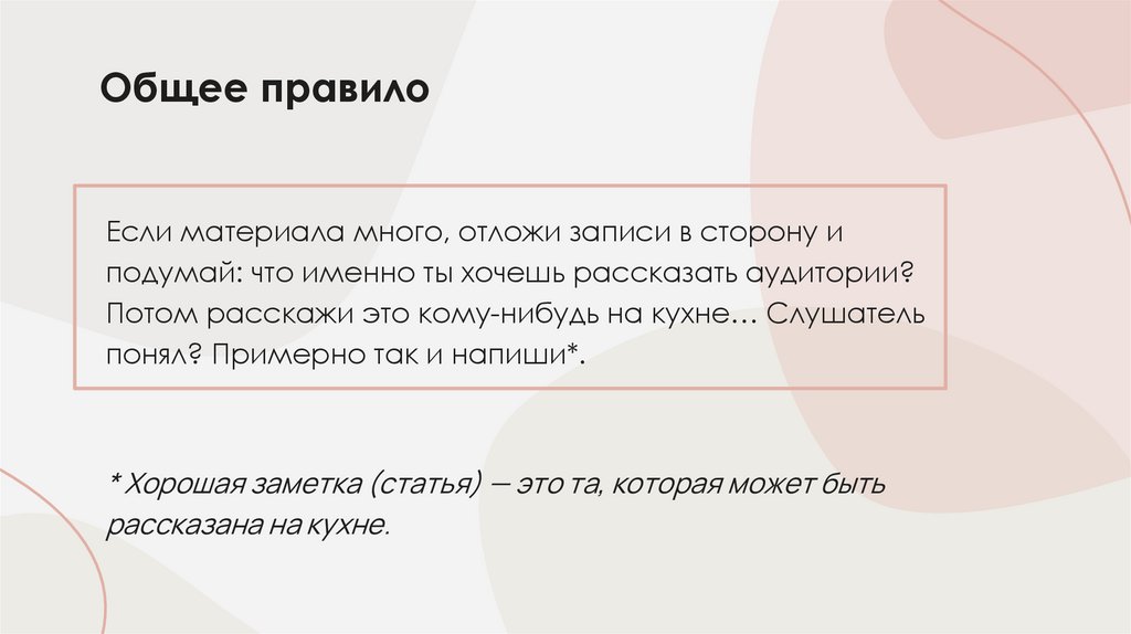 Если материала много, отложи записи в сторону иподумай: что именно ты хочешь рассказать аудитории?
