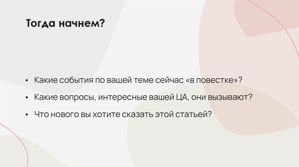 ▪ Какие события по вашей теме сейчас «в повестке»?▪ Какие вопросы, интересные вашей ЦА, они вызывают?