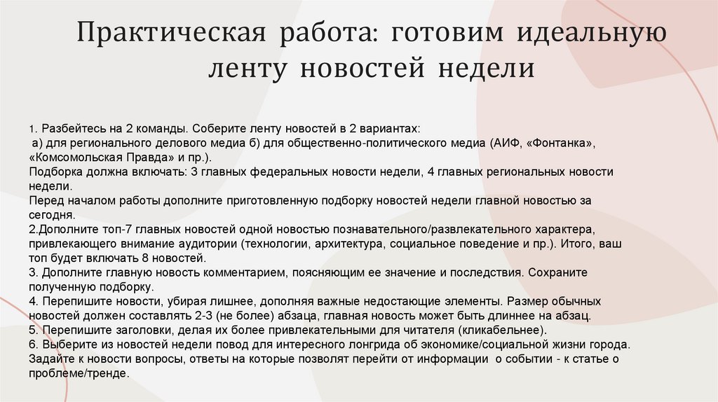 1. Разбейтесь на 2 команды. Соберите ленту новостей в 2 вариантах:а) для регионального делового медиа б) для общественно-политического медиа (АИФ, «Фонтанка»,