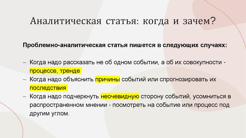 Проблемно-аналитическая статья пишется в следующих случаях:Когда надо рассказать не об одном событии, а об их совокупности процессе, тренде