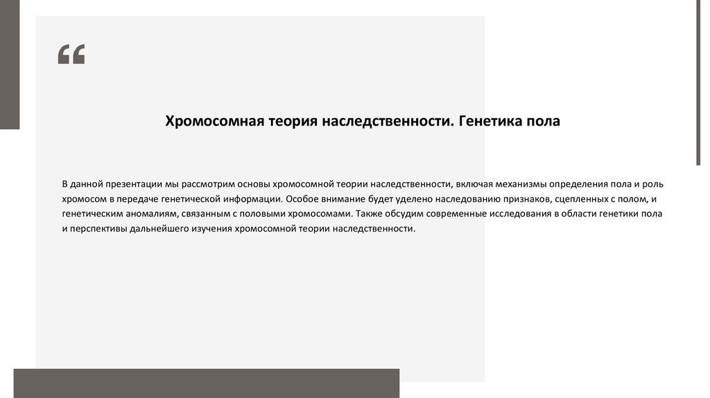 Хромосомная теория наследственности. Генетика полаВ данной презентации мы рассмотрим основы хромосомной теории наследственности, включая механизмы определения пола и роль