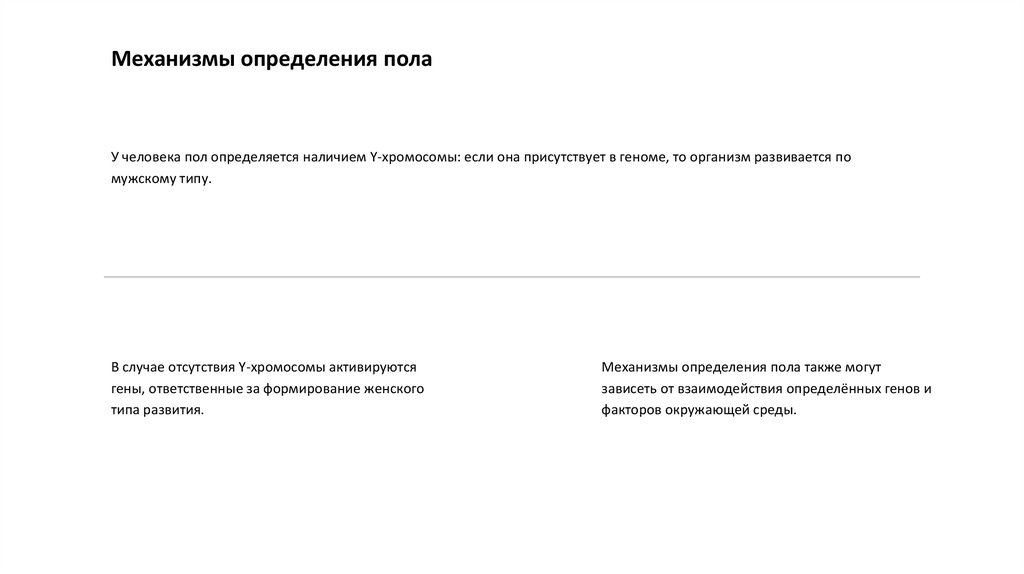 Механизмы определения полаУ человека пол определяется наличием Y-хромосомы: если она присутствует в геноме, то организм развивается по