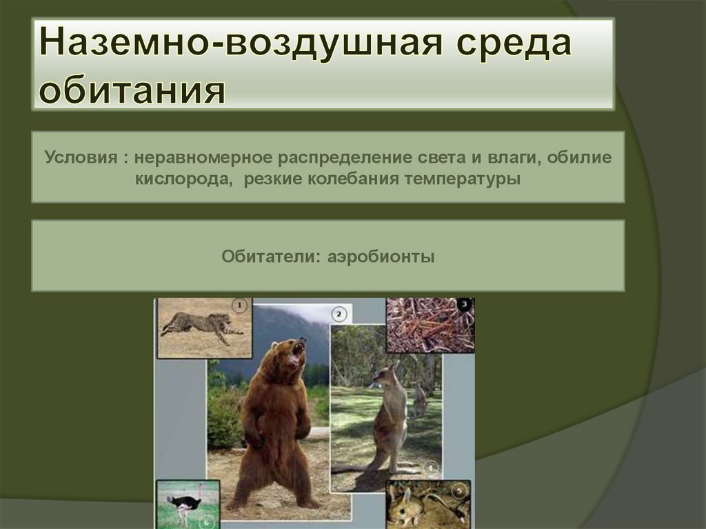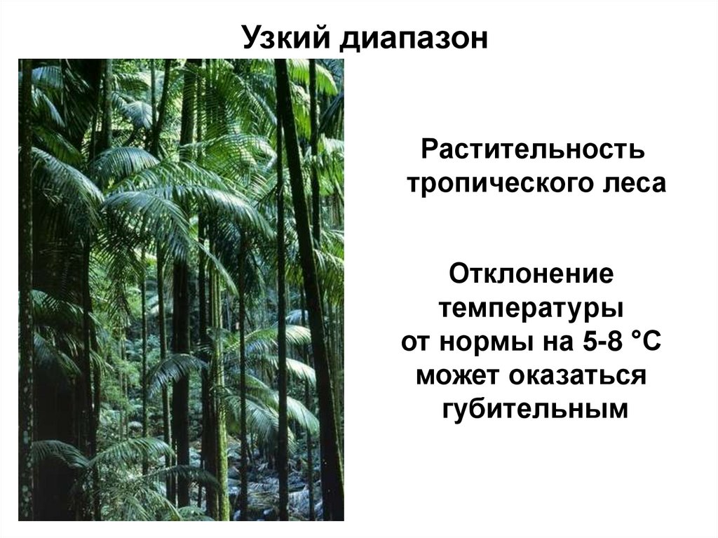 Условия : неравномерное распределение света и влаги, обилиекислорода, резкие колебания температуры