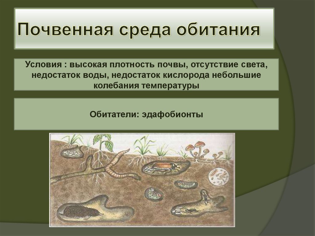 Условия : высокая плотность почвы, отсутствие света,недостаток воды, недостаток кислорода небольшие