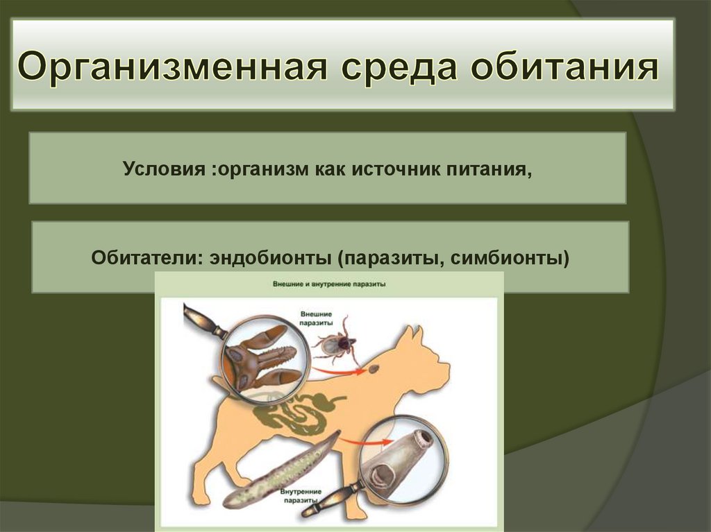Условия :организм как источник питания,Обитатели: эндобионты (паразиты, симбионты)