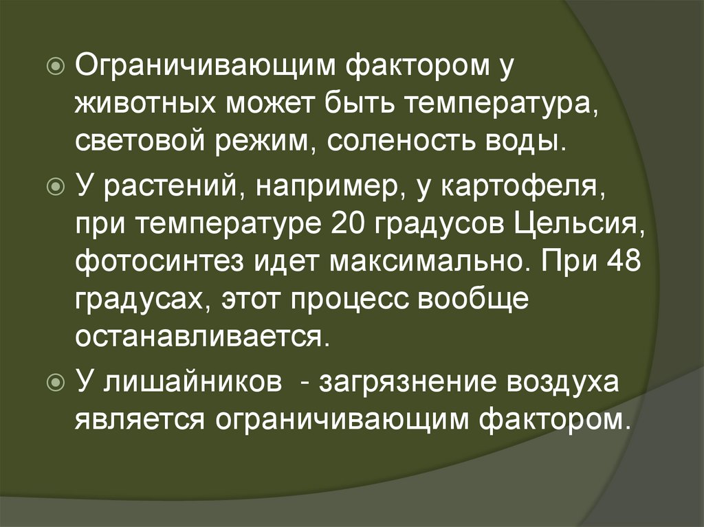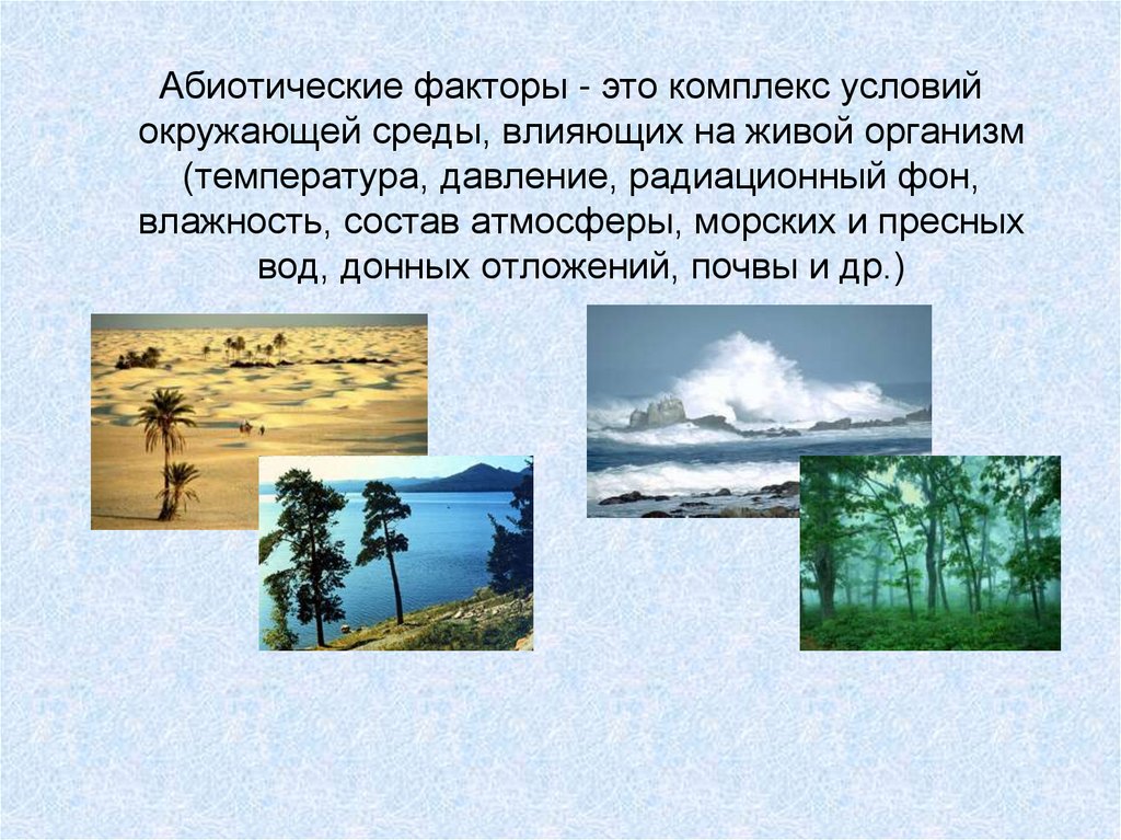Абиотические факторы - это комплекс условийокружающей среды, влияющих на живой организм