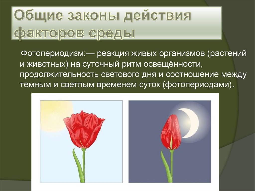Фотопериодизм:— реакция живых организмов (растенийи животных) на суточный ритм освещённости,
