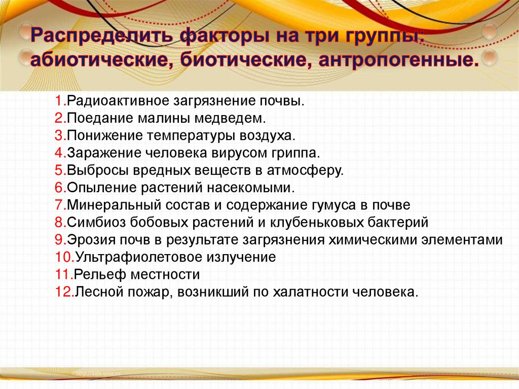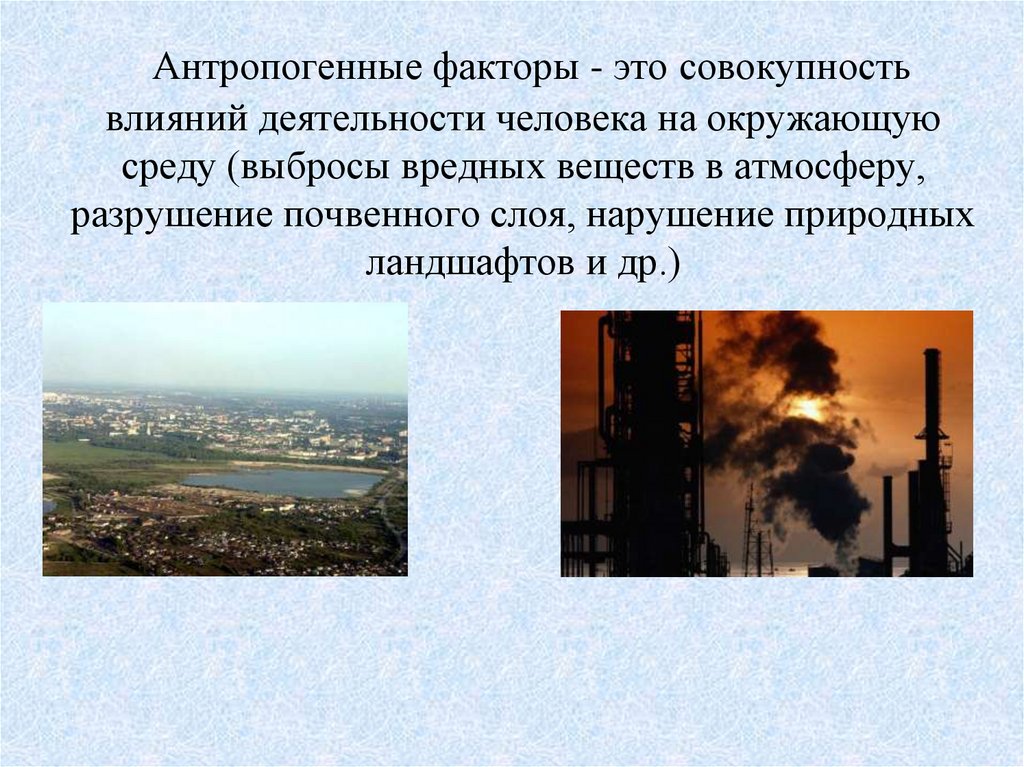 6. Антропогенные факторы - это совокупность влияний деятельности человека на окружающую среду (выбросы вредных веществ в