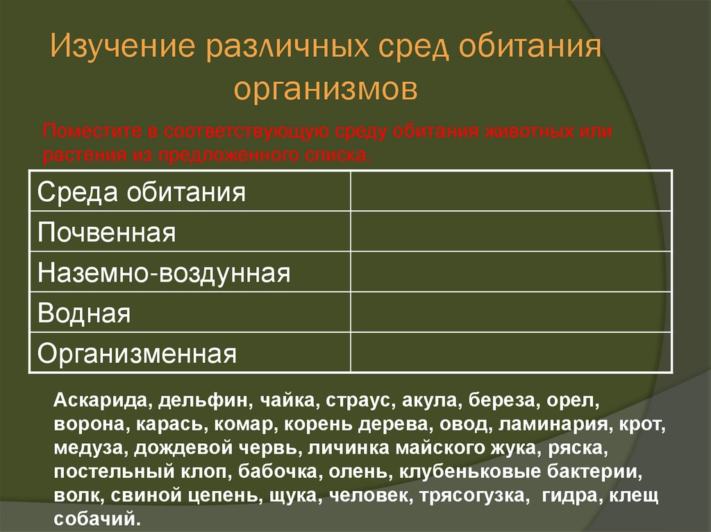 Поместите в соответствующую среду обитания животных илирастения из предложенного списка.