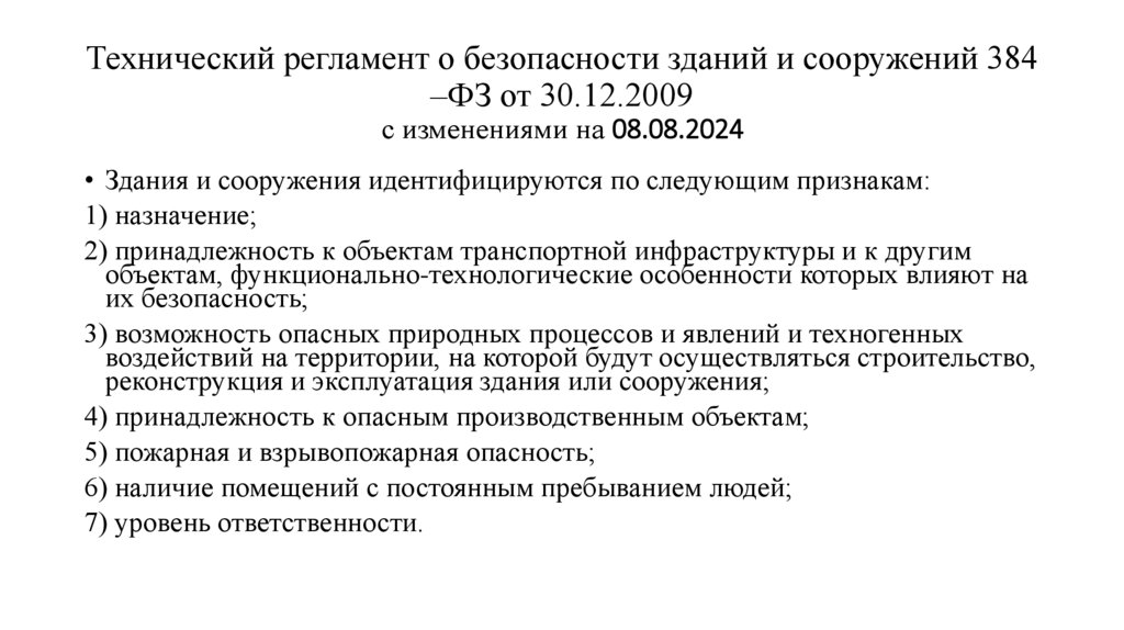 1. Технический регламент о безопасности зданий и сооружений 384 –ФЗ от 30.12.2009 с изменениями на 08.08.2024
