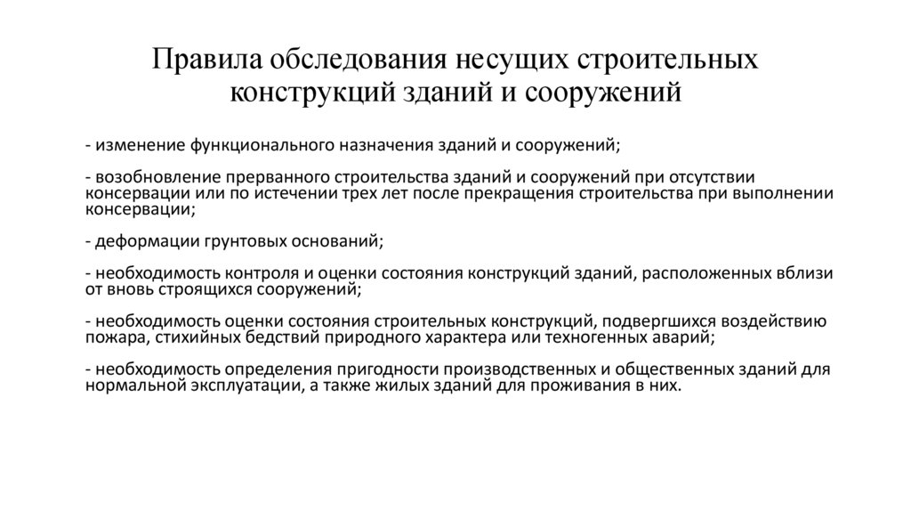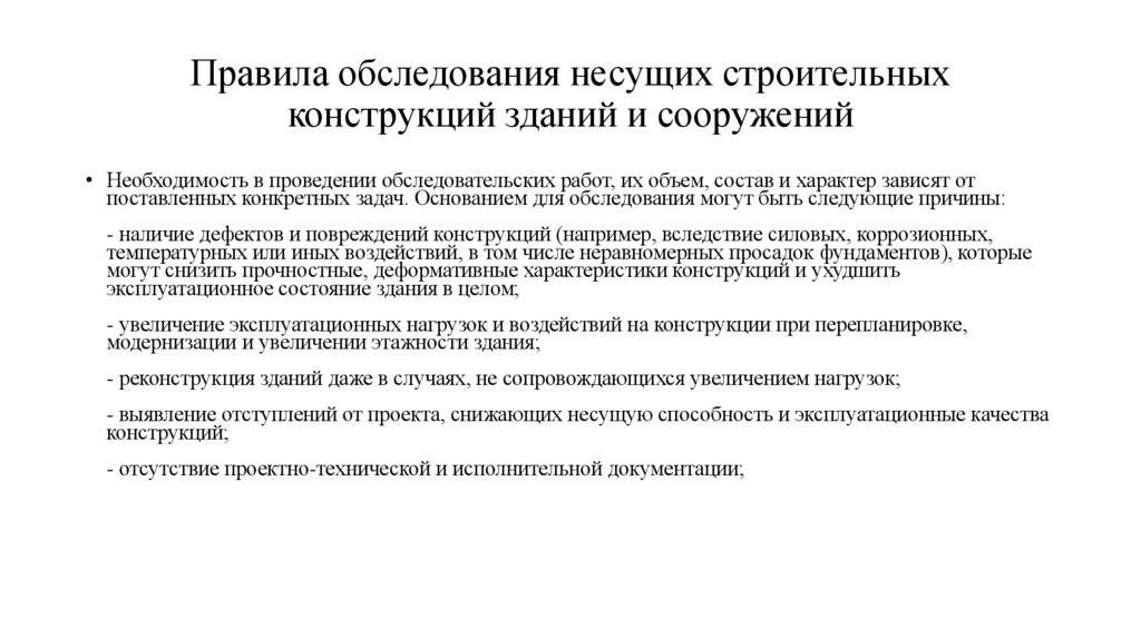 • Необходимость в проведении обследовательских работ, их объем, состав и характер зависят отпоставленных конкретных задач. Основанием для обследования могут быть следующие причины: