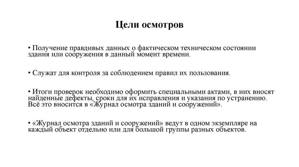 • Получение правдивых данных о фактическом техническом состоянииздания или сооружения в данный момент времени.