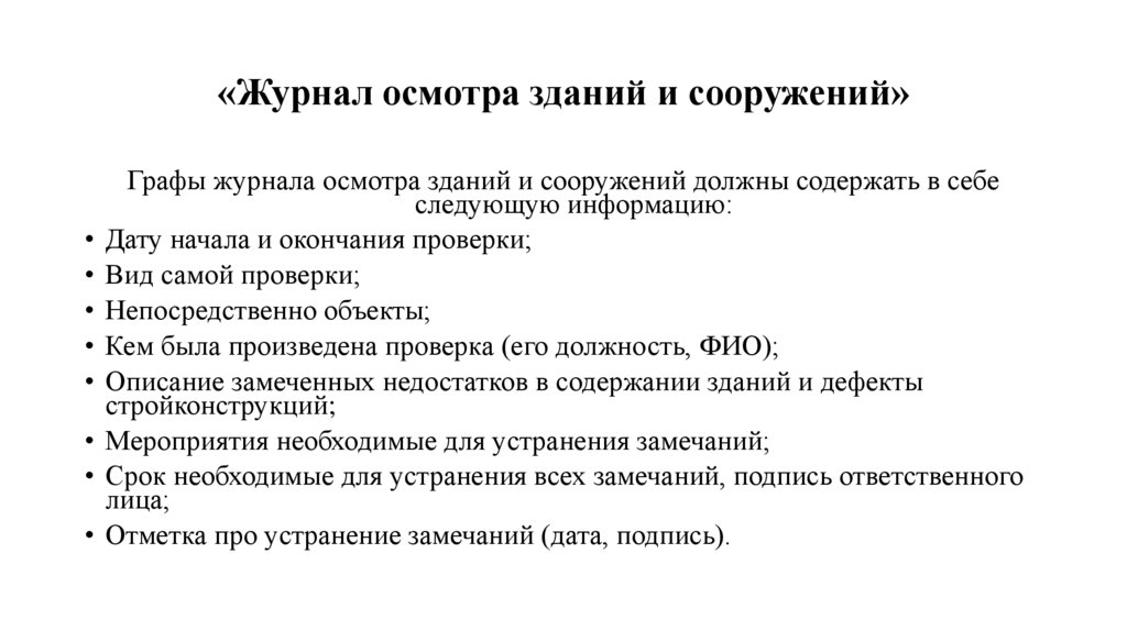 Всё это вносится в «Журнал осмотра зданий и сооружений».