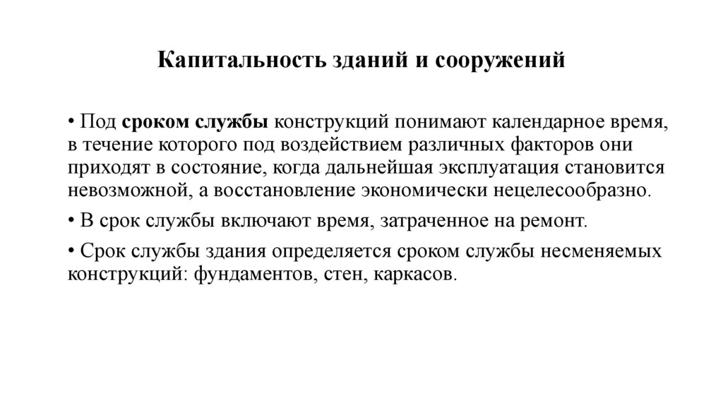 • Под сроком службы конструкций понимают календарное время,в течение которого под воздействием различных факторов они
