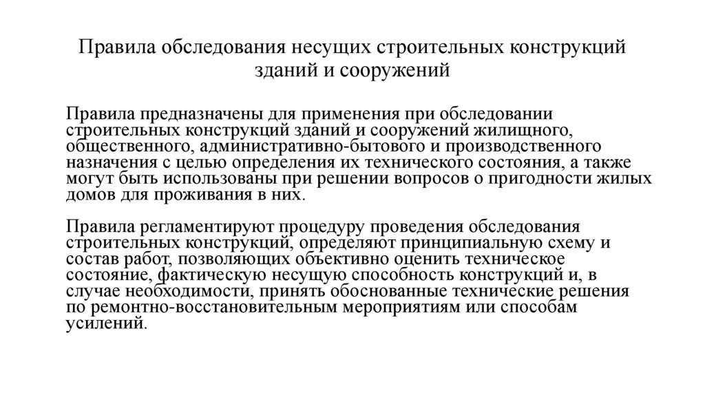 Правила предназначены для применения при обследованиистроительных конструкций зданий и сооружений жилищного,