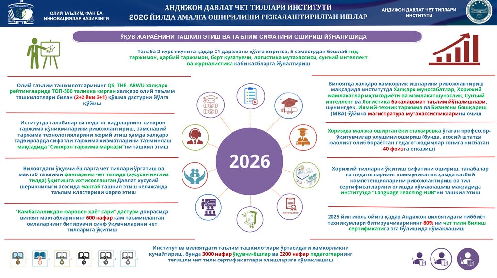 ЎҚУВ ЖАРАЁНИНИ ТАШКИЛ ЭТИШ ВА ТАЪЛИМ СИФАТИНИ ОШИРИШ ЙЎНАЛИШИДАТалаба 2-курс якунига қадар C1 даражани қўлга киритса, 5-семестрдан бошлаб гидтаржимон, ҳарбий таржимон, борт кузатувчи, логистика мутахассиси, сунъий интеллект