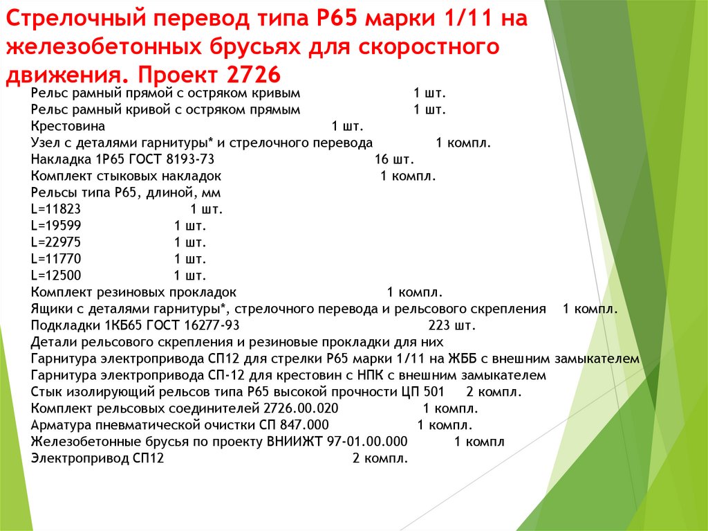 8. Стрелочный перевод типа Р65 марки 1/11 на железобетонных брусьях. Проект 2750