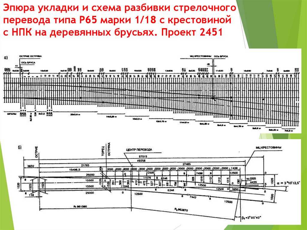 14. Эпюра укладки и схема разбивки стрелочного перевода типа Р65 марки 1/18 с крестовиной с НПК на деревянных брусьях. Проект 2451