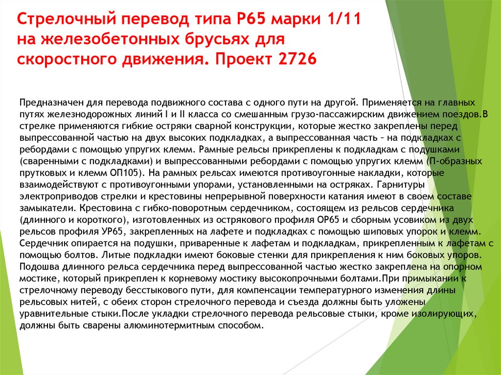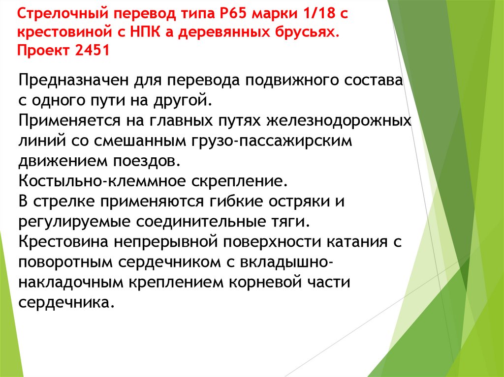Предназначен для перевода подвижного состава с одного пути на другой.Применяется на главных путях железнодорожных линий I и II класса со