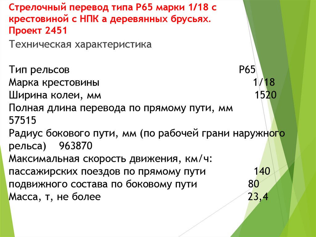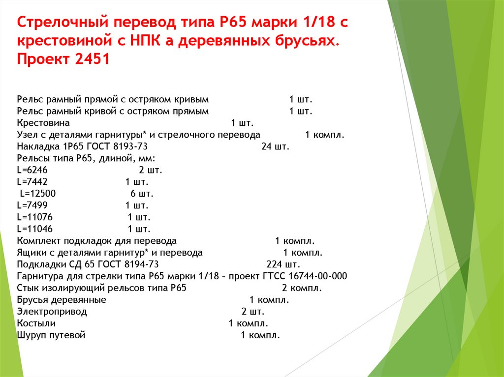 16. Стрелочный перевод типа Р65 марки 1/18 с крестовиной с НПК а деревянных брусьях. Проект 2451