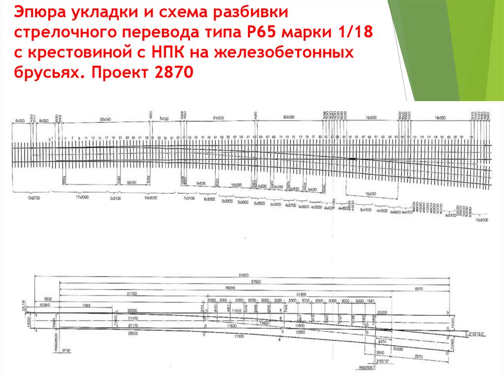 18. Эпюра укладки и схема разбивки стрелочного перевода типа Р65 марки 1/18 с крестовиной с НПК на железобетонных брусьях. Проект