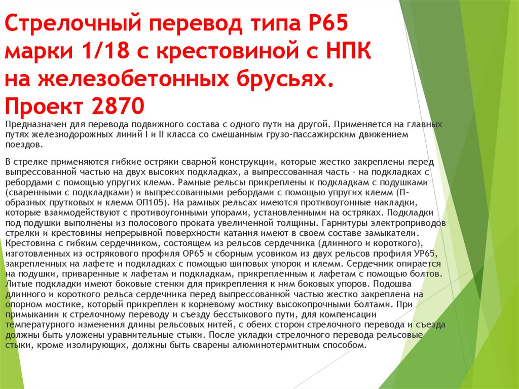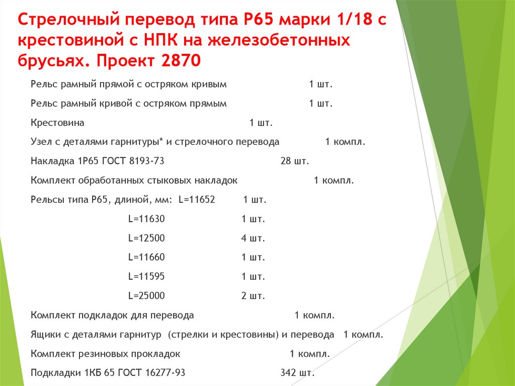 21. Стрелочный перевод типа Р65 марки 1/18 с крестовиной с НПК на железобетонных брусьях. Проект 2870