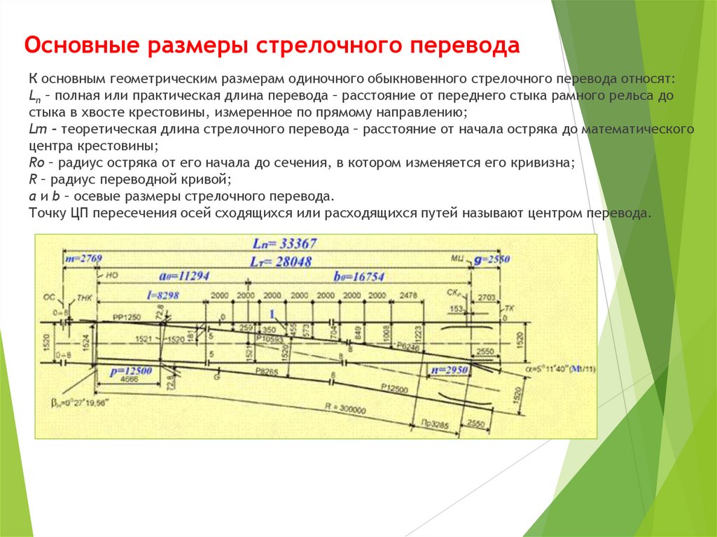 К основным геометрическим размерам одиночного обыкновенного стрелочного перевода относят:Lп – полная или практическая длина перевода – расстояние от переднего стыка рамного рельса до