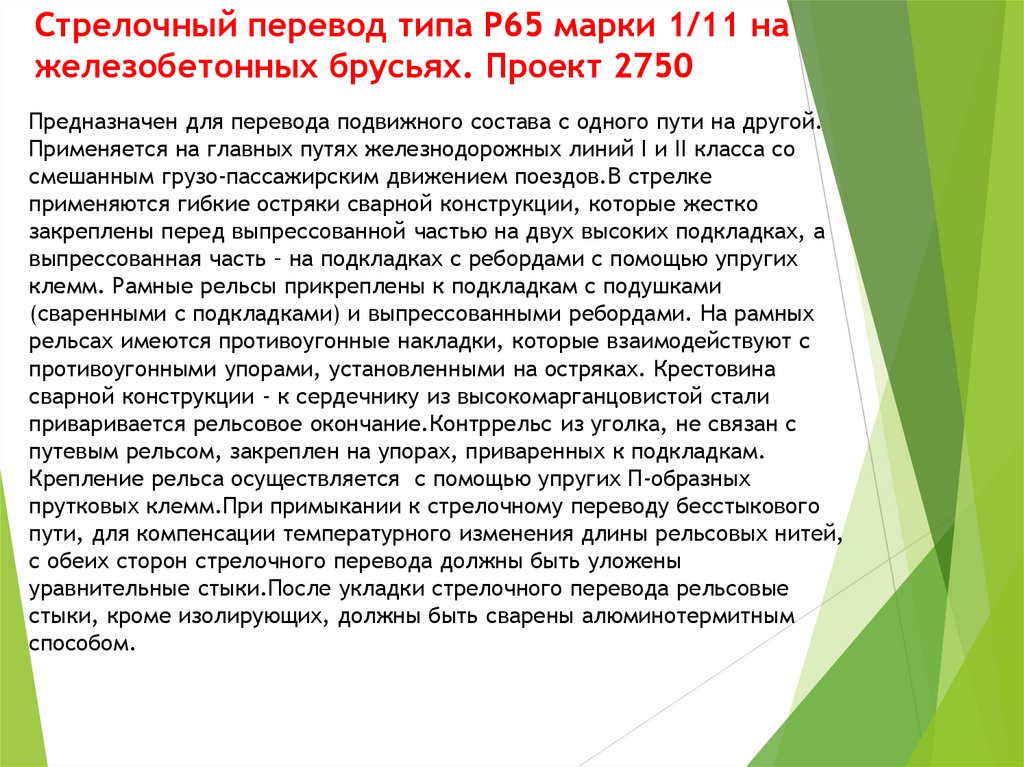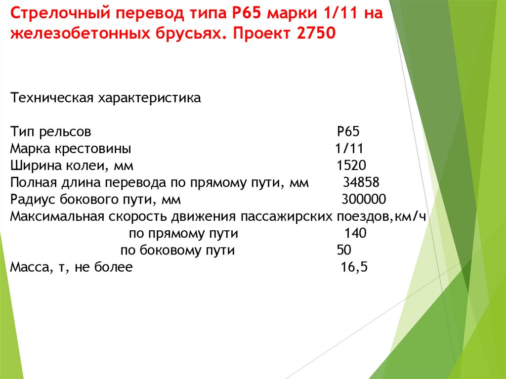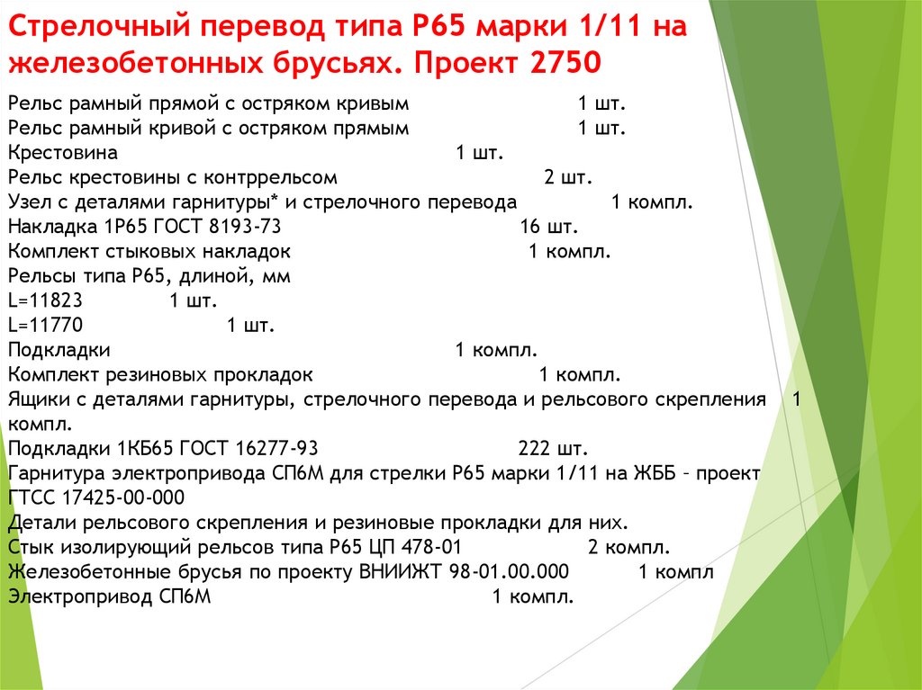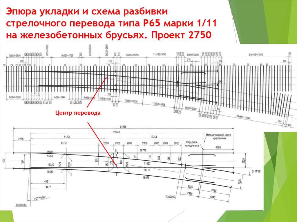 Центр перевода6. Стрелочный перевод типа Р65 марки 1/11 на железобетонных брусьях. Проект 2750