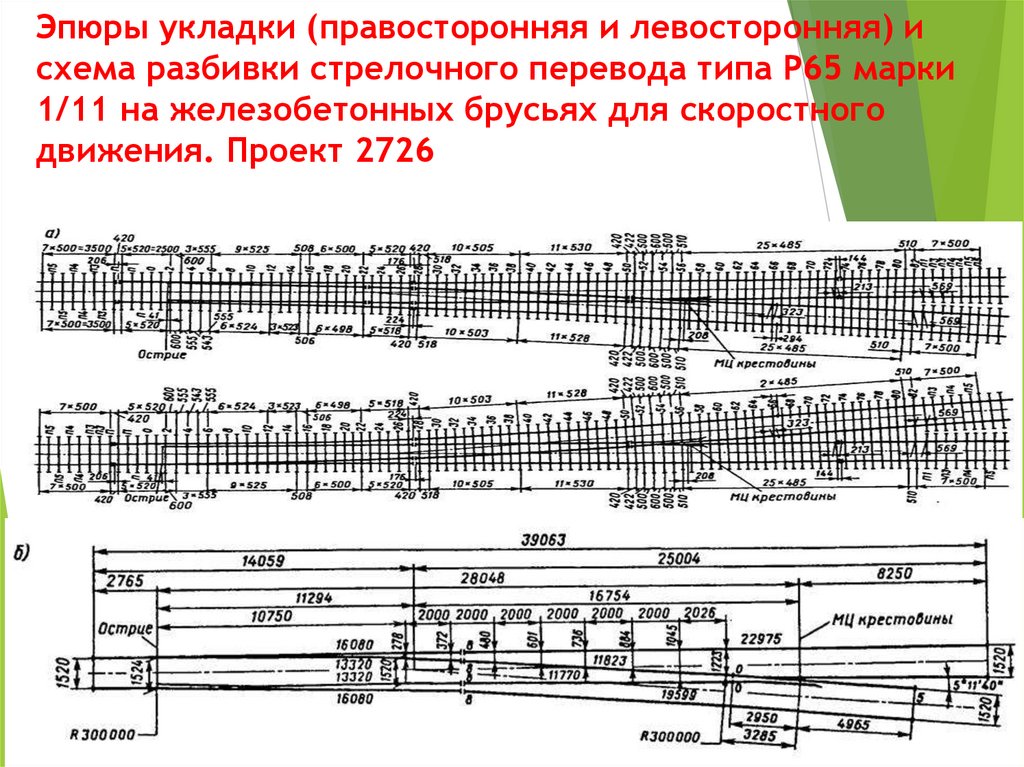 5. Эпюра укладки и схема разбивки стрелочного перевода типа Р65 марки 1/11 на железобетонных брусьях. Проект 2750