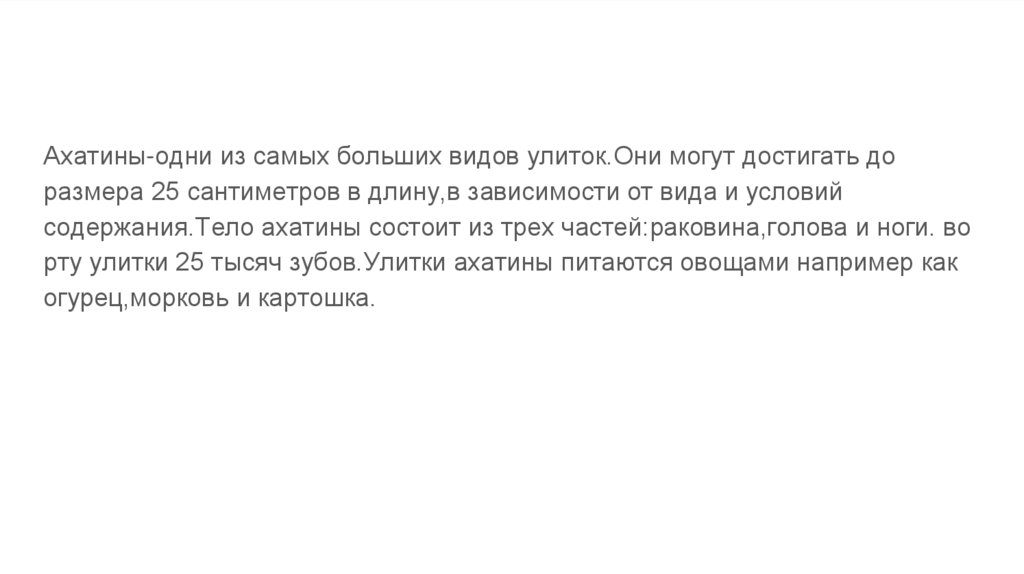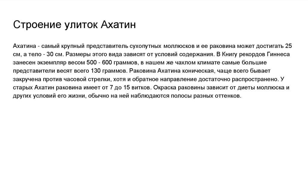 Ахатины-одни из самых больших видов улиток.Они могут достигать доразмера 25 сантиметров в длину,в зависимости от вида и условий