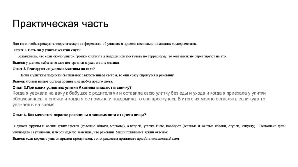 Практическая частьДля того чтобы проверить теоретическую информацию об улитках я провела несколько домашних экспериментов.