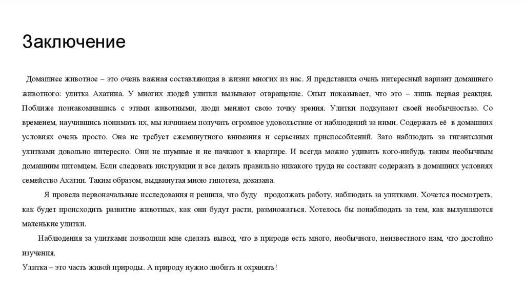 Наблюдения за улитками позволили мне сделать вывод, что в природе есть много, необычного, неизвестного нам, что достойно
