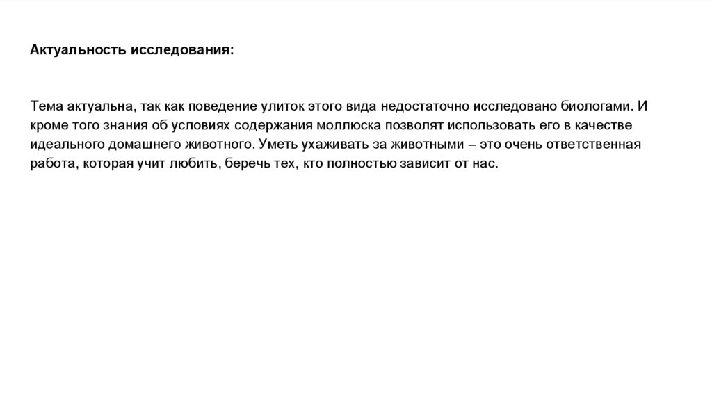 Актуальность исследования:Тема актуальна, так как поведение улиток этого вида недостаточно исследовано биологами. И