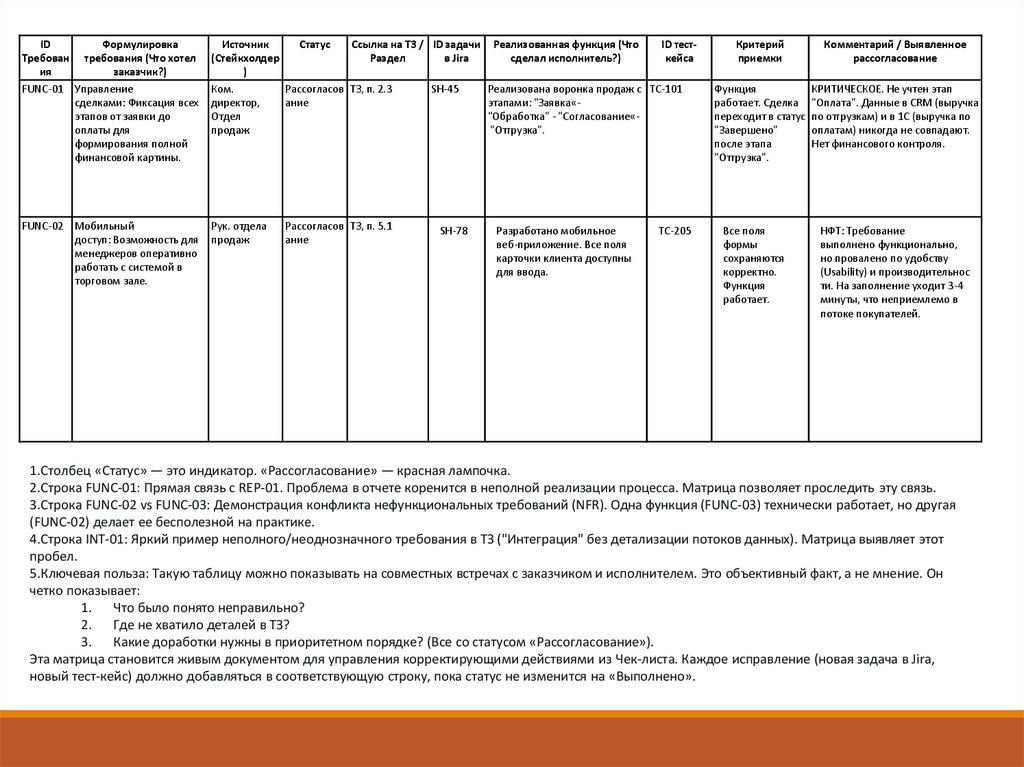 2.Строка FUNC-01: Прямая связь с REP-01. Проблема в отчете коренится в неполной реализации процесса. Матрица позволяет проследить эту связь.