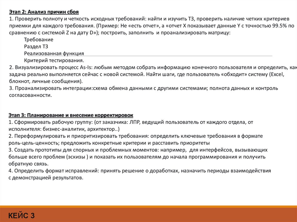 Этап 2: Анализ причин сбоя1. Проверить полноту и четкость исходных требований: найти и изучить ТЗ, проверить наличие четких критериев