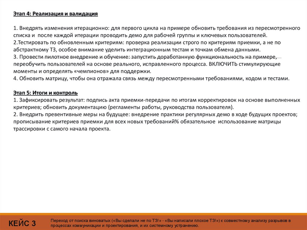 приемки для каждого требования. (Пример: Не «есть отчет», а «отчет Х показывает данные Y с точностью 99.5% по