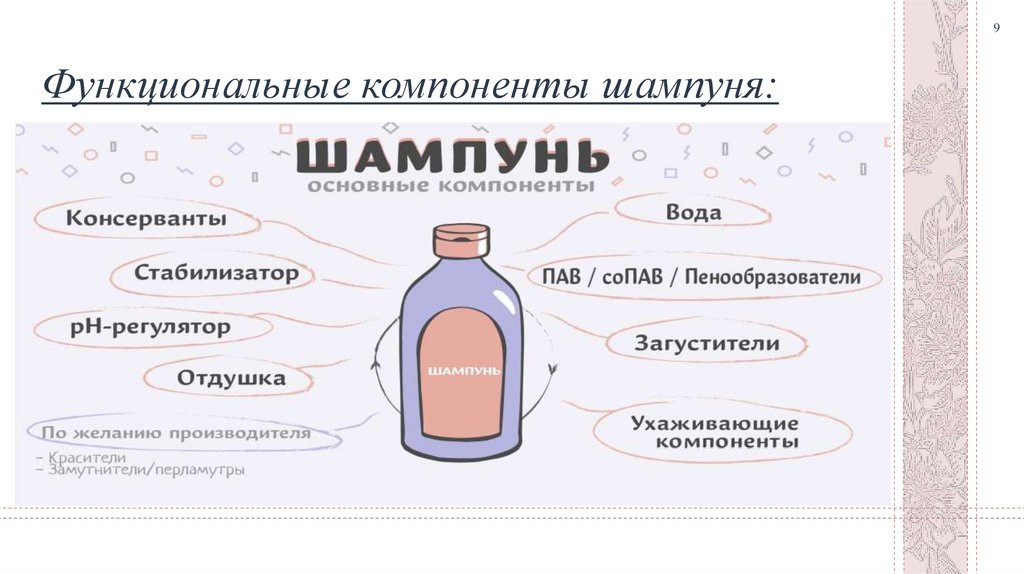 9Функциональные компоненты шампуня: