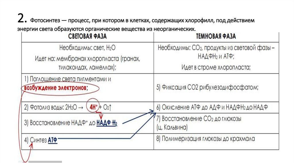 2. Фотосинтез — процесс, при котором в клетках, содержащих хлорофилл, под действиемэнергии света образуются органические вещества из неорганических.