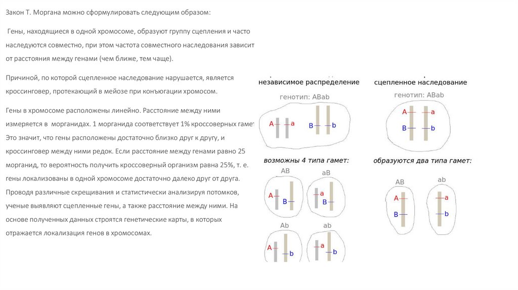 Закон Т. Моргана можно сформулировать следующим образом:Гены, находящиеся в одной хромосоме, образуют группу сцепления и часто